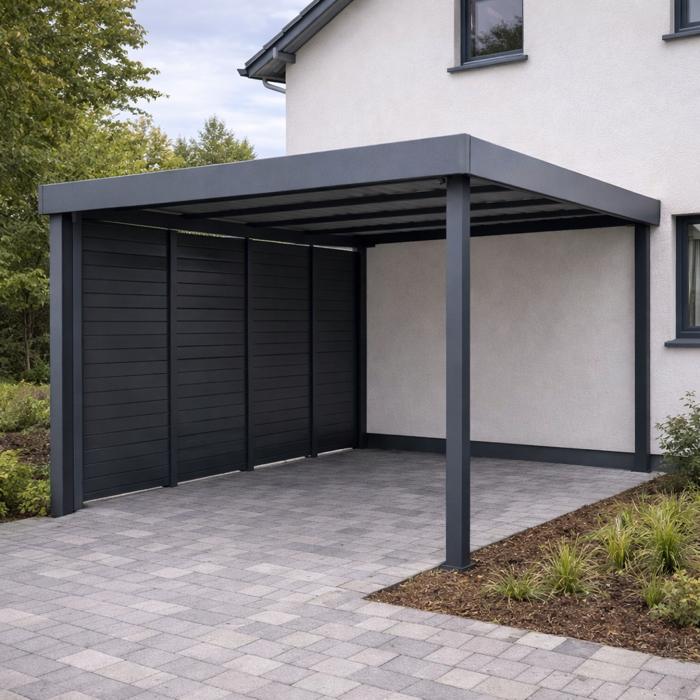 Entscheidend für eine stabile Konstruktion ist eine präzise Planung der Details. Fachgerecht gesetzte Pfosten auf einem stabilen Fundament, korrekt berechnete Schneelast sowie eine saubere Befestigung sorgen dafür, dass der Carport langfristig stabil steht. Beim Flachdach sorgt ein leichtes Gefälle für einen zuverlässigen Wasserablauf, optional kann auch eine integrierte Regenrinne ergänzt werden.